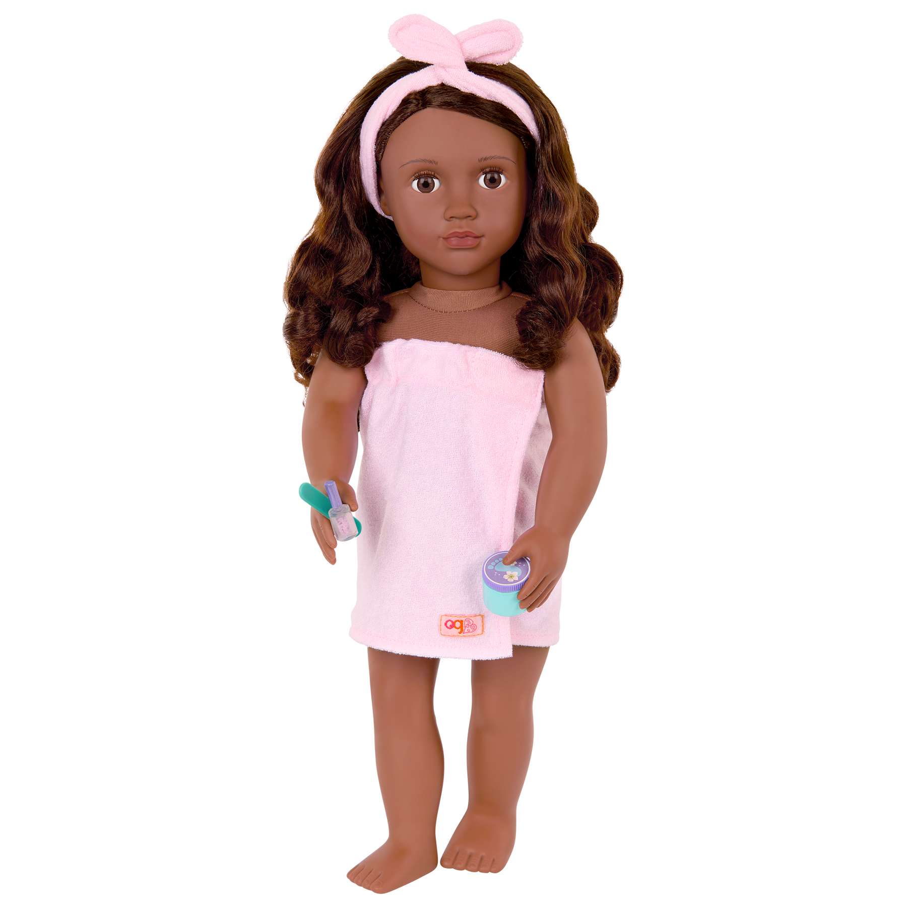 Get your spa day on with the Our Generation Spa Day Fun set for 46 cm dolls! Pamper your favorite dolls with a headband and towel wrap as you apply a soothing cucumber face mask. Donât forget the cucumber slices on the eyes. The fresher, the better! And nothing is more relaxing than a nice long foot spa! Dip your doll's toes into the foot bath and let the relaxation begin! Themed accessories like bath bombs, nail files, nail polish, nail clipper, jar of cream, and foot brush open up lots of self-care and sweet storytelling. Makes a fun addition to doll care sets and collections. Our Generation doll accessories are a great gift for kids ages 3+ (small parts), encouraging them to imagine their own unique stories. Our Generation dolls sold separately.