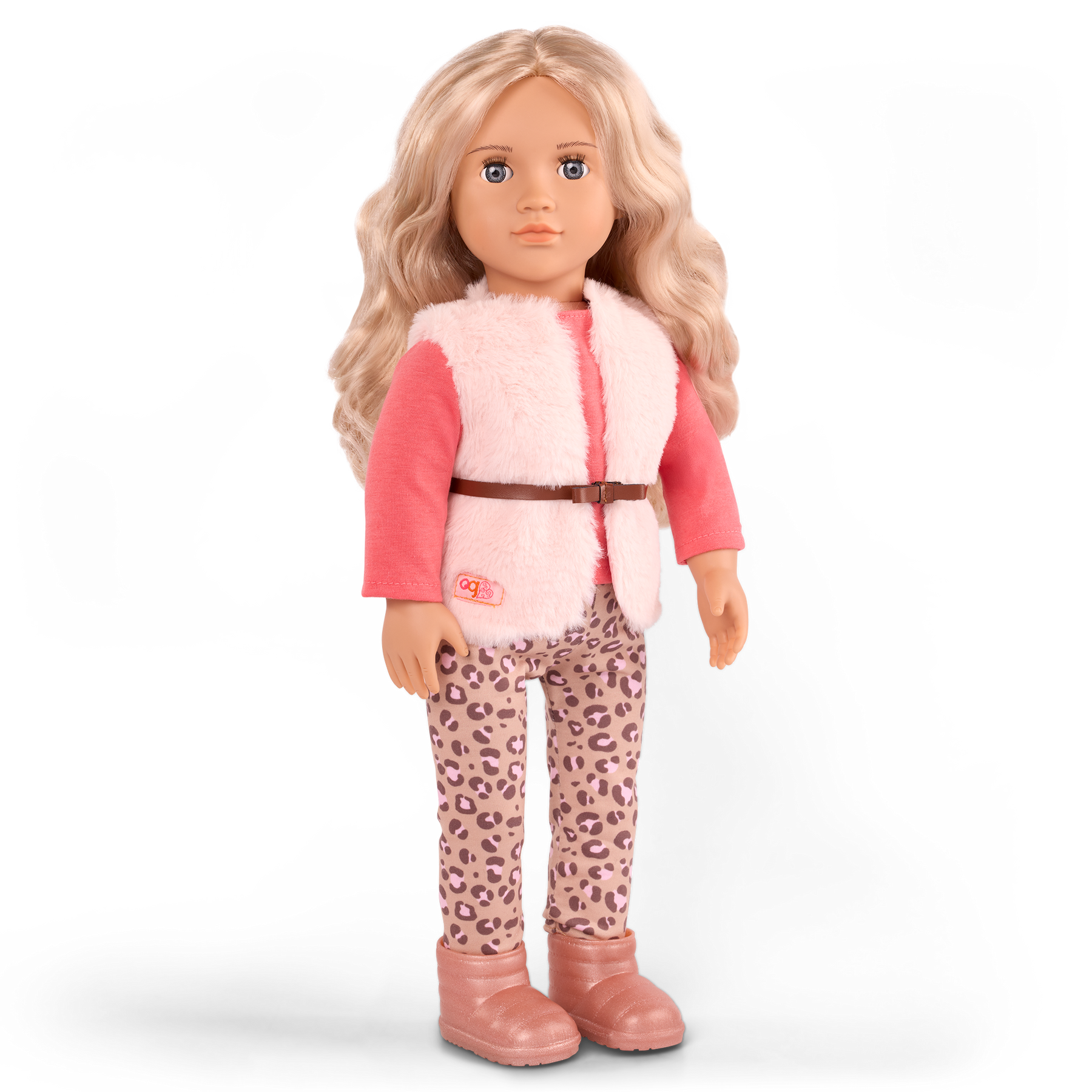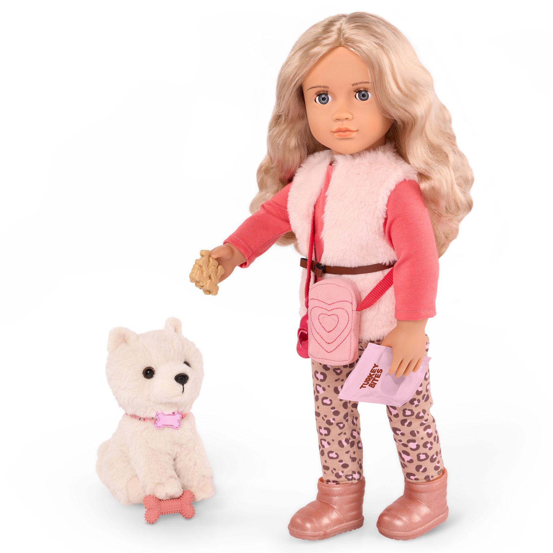 Our Generation doll and pet duos inspire double the friendship fun for kids, especially animal lovers! Kinsley's playful pup, Kenzi, is a 15 cm Shih Tzu with soft plush fur, cute pointy ears, and a bright pink collar. Bring Kenzi out and about with a dog leash that really clips to the collar, and pack extra puppy toys and treats inside Kinsley's crossbody bag for on-the-go storytelling! Kinsley has a huggable soft body and lifelike features to delight doll fans during playtime. Her expressive gray eyes open and close, and her wavy, light-blonde hair is fun to style in many ways. She wears leopard-print leggings with cute shoes, a sweater, and a faux-fur vest overtop. For kids who love dress-up, her outfit has easy-open closures to quickly put on and remove. So they can mix, match, and create even more fun looks on every journey! Our Generation 46 cm dolls make a great gift for kids ages 3+ (small parts), encouraging them to imagine their own unique stories.