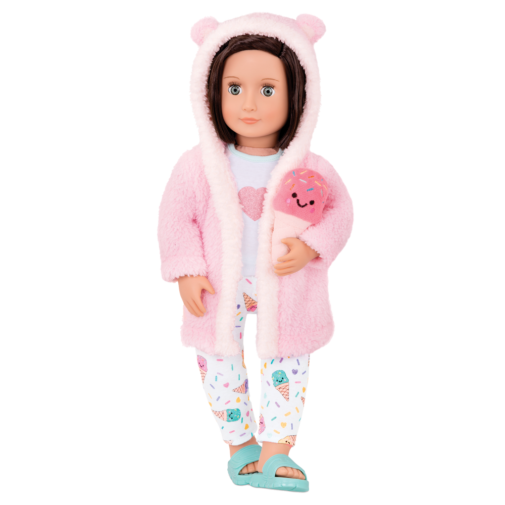 I dream, you dream, we all dream of ice cream! Keep your 18-inch Our Generation doll cozy in the Ice Cream Dreams outfit! These bedtime pajamas feature a soft, fluffy, pink hooded robe and blue sandal-style slippers for your dolls to grab a nighttime snack – they can even snuggle with the ice cream cone plush! Easily dress your besties in the cute top with the decorative heart, and the pajama bottoms with mini ice cream prints will give them extra sweet style during their super fun slumber parties! (Dolls sold separately)