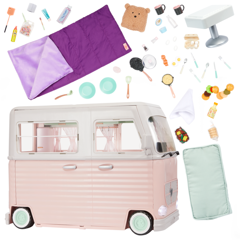Little campers can travel coast to coast and create the ultimate road trips with the Our Generation Country Cruising RV! This impressive camper for 18-inch dolls is packed with interactive features, including lights, a movable steering wheel and wipers, rolling wheels, a honking horn, and GPS navigation that plays 8 sounds! Kids will also discover a fully stocked kitchen and built-in bathroom inside the camper. And it folds open to expand the dining area and set up a campsite. Plus, it comes with 55+ additional pieces to load the camper on every fun-filled adventure! The Our Generation RV camper makes a great gift for doll fans and little travelers ages 3+ (small parts). Measures approximately 20.5" (H) x 27.5" (W) x 16" (D). Compatible with most 18-inch dolls and accessories. Dolls sold separately.