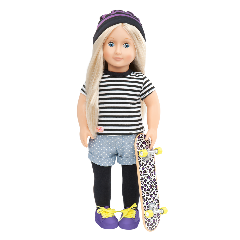 Affiche ton style au skatepark avec la tenue That's How I Roll pour poupées Our Generation de 46 cm! La planche à roulettes aux motifs de peau de léopard permettra à tes poupées d’effectuer des glissés, de s’exercer sur la demi-lune et de réaliser des vrilles tout en faisant preuve de style! Cette tenue branchée et flamboyante comprend un short à pois amusants, un legging confortable et un T-shirt tout-aller à rayures. Complète ce look de planchiste tendance avec le bonnet aux rayures noires et mauves, et noue les lacets jaunes des chaussures lorsque vient le temps de rouler. Cette tenue est dotée de fermetures faciles à ouvrir qui facilitent les changements de tenue et te permettent de créer tes propres agencements avec d’autres genres de vêtements. Tes poupées peuvent ainsi adopter différents looks lors de leurs aventures amusantes! (Poupées vendues séparément)